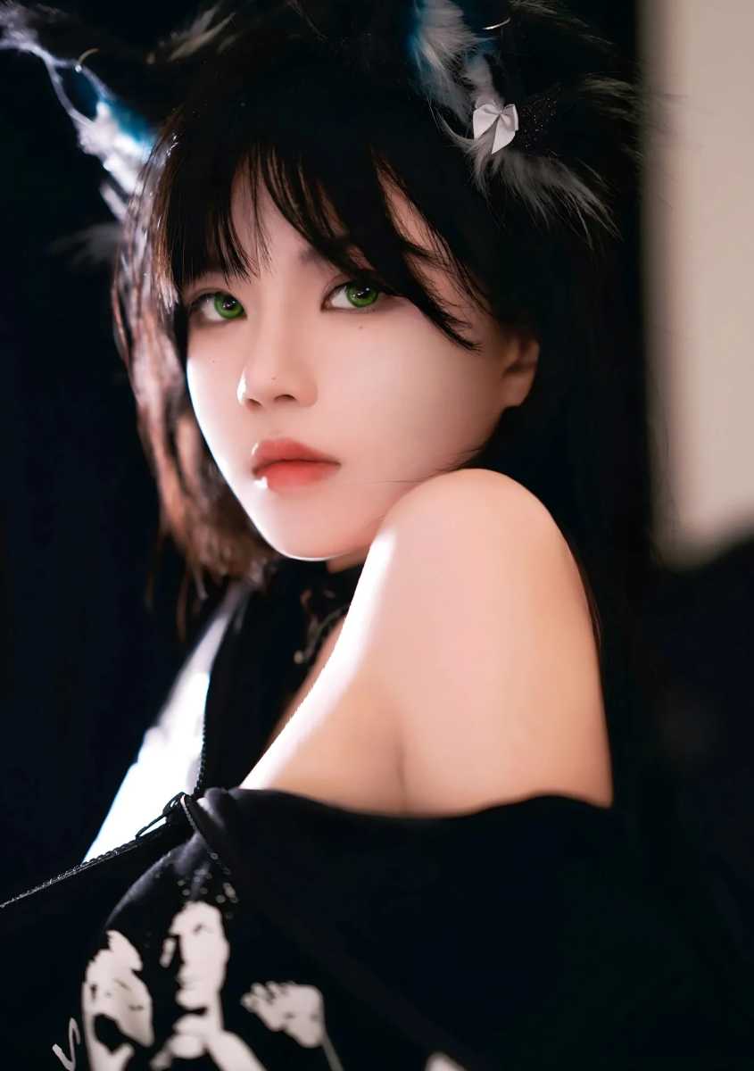 咱先瞅瞅这第一张图,小编我刚看到的时候,直接就被那双绿荧荧的眼珠子给勾住了。真的,这种翡翠绿的瞳色配上漆黑的长发,那种野性里带着点异域风情的味道瞬间就出来了。她头上那对大猫耳,质感做得真不错,毛茸茸的边缘还带着点蓝色渐变,这种细节上的考究,确实看得出是用心了,不是那种地摊货能比的。