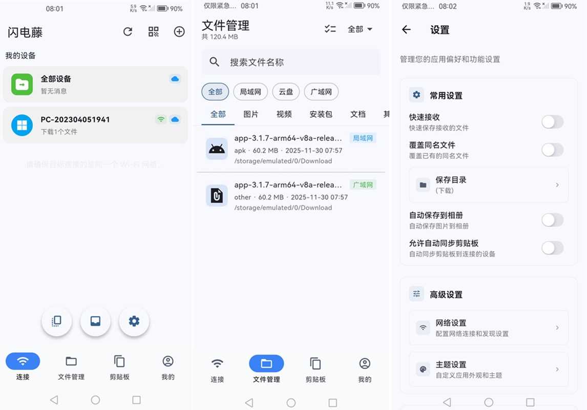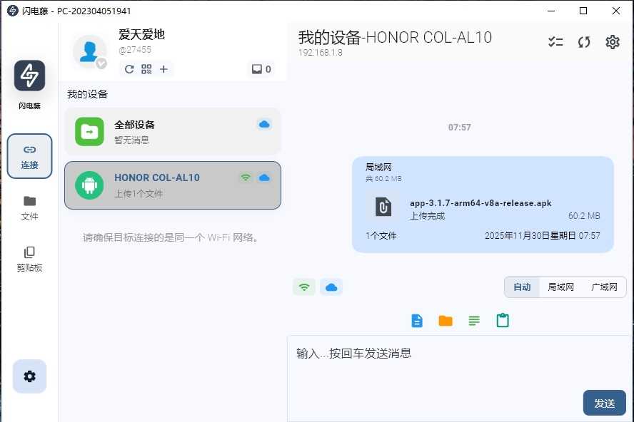 闪电藤中文版是基于LocalSend二次开发的一款局域网文件传输工具,在它的基础上进行UI交互的重新设计,以及功能上的增强和删减,使其更加符合中国用户的使用体验。有了LocalSend,还要开发闪电藤,在于LocalSend的更新迭代速度较慢,并且它的使用体验更多的是按国外的来设计的,国内很多需求反馈无法实现,所以我重新设计LocalSend,并征集大家的需求,共同建设一个更完美的LocalSend。