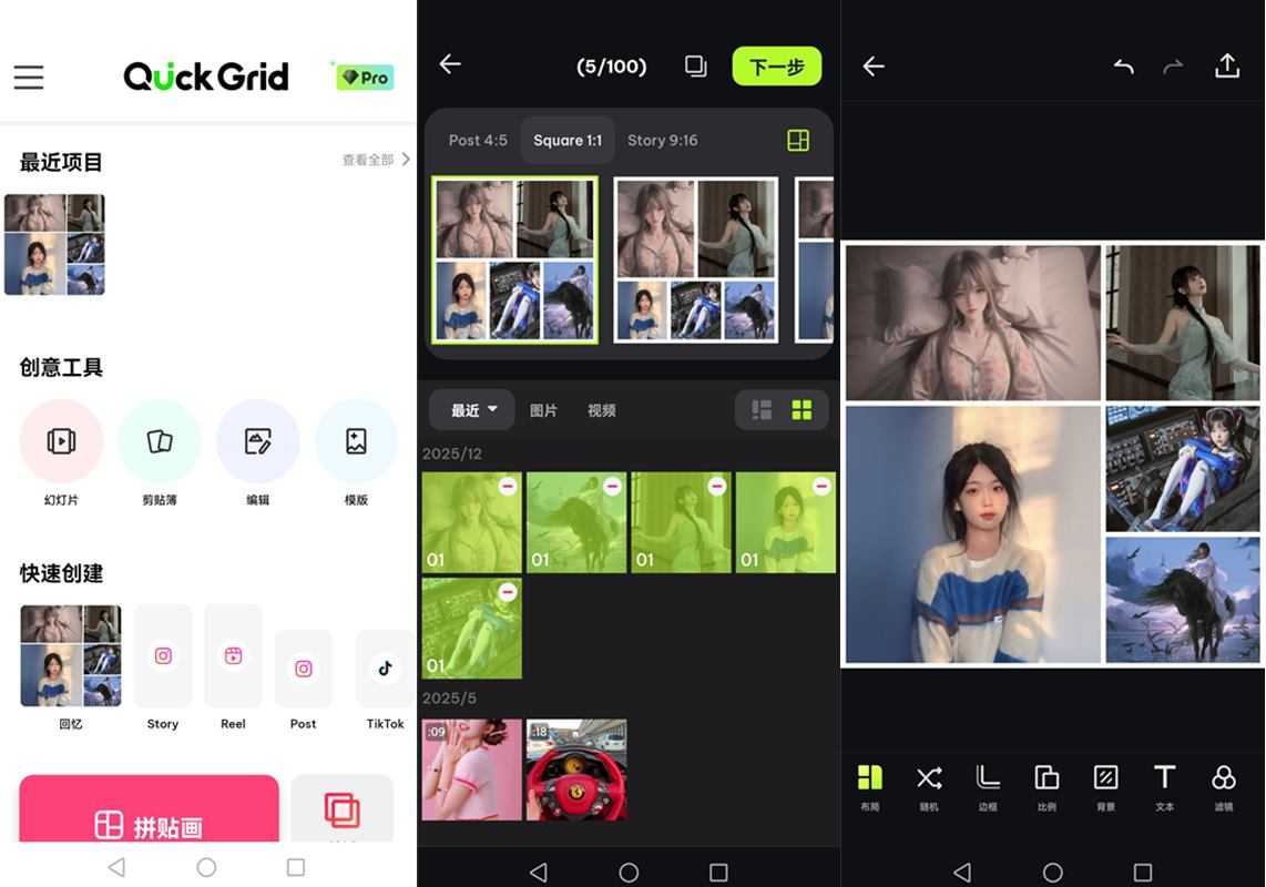 QuickGrid 通过提供专业的拼贴模板、灵活的编辑工具与 AI 辅助功能,帮助用户高效制作高质量的照片与视频拼贴内容。其持续的功能更新与社交媒体适配设计,使其成为个人记录与内容创作者实用的视觉制作工具。