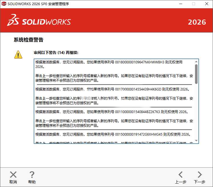 如果警告“激活数据库中找不到SolidWorks序列号” 出现,忽略它(单击“确定”继续)