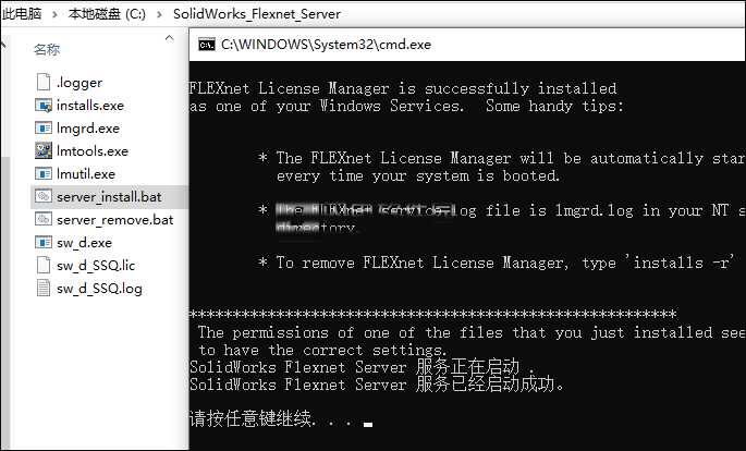 3、将文件夹“SolidWorks_Flexnet_Server”复制到C:,以管理员身份运行“SolidWorks_Flexnet_Server\Server_install.bat”,并等待新服务“SolidWorks Flexnet Server”安装并启动
