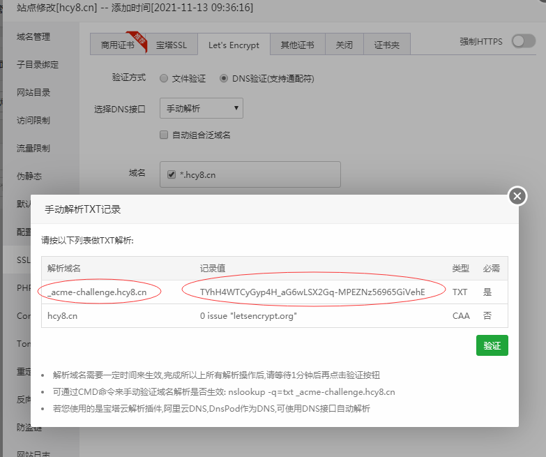 很多小伙伴主机记录会填错,这里不是填 _acme-challenge.hcy8.cn 而是 _acme-challenge 切记