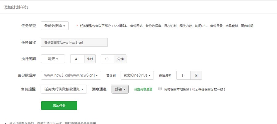 1)点击堡塔面板 计划任务,新建 备份数据库 选择一个数据库,设置备份到 微软OneDrive,然后添加任务。任务执行失败邮件提醒这个功能就不做解释了,自行选择设置开通。